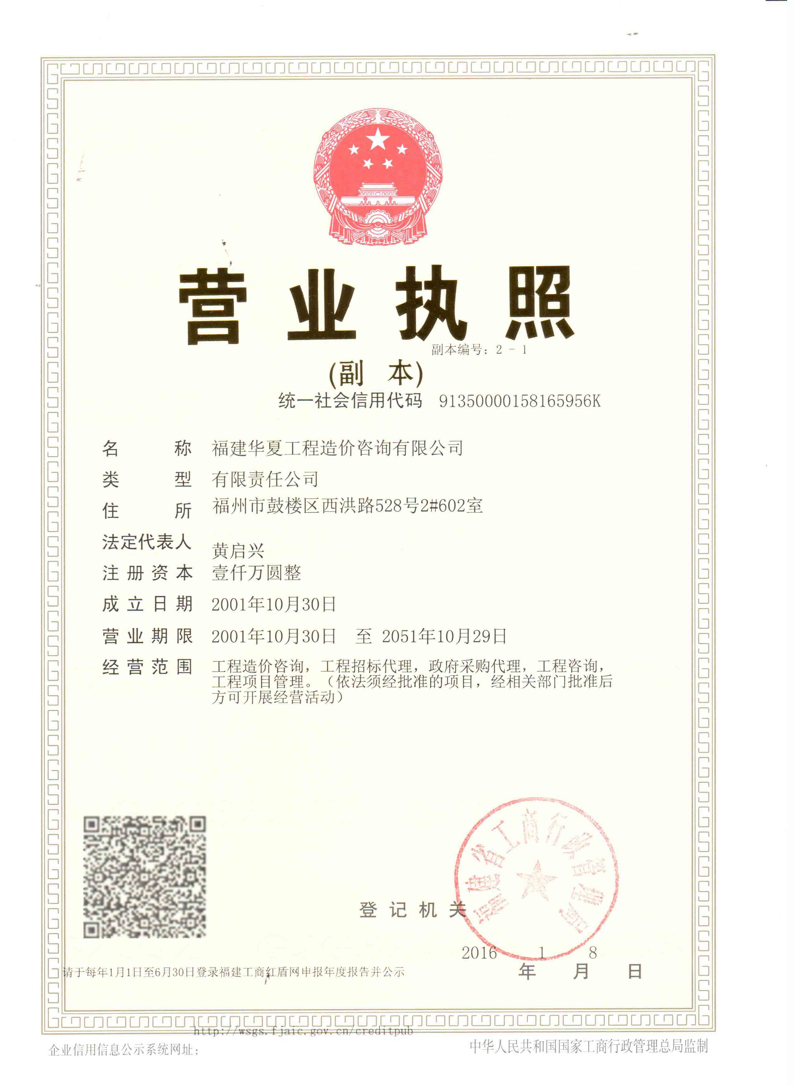 2016年1月8日,我公司获得最新“三证合一”的营业执照。同时注册资本由原来的300万人民币增资到1000万人民币;经营范围在原来的基础上增加两项“政府采购代理;工程项目管理”。此举体现了我公司雄厚的资本实力,也体现了我公司不仅在工程造价行业上取得非凡的成就,更要在工程行业中多元化发展,为公司的进一步壮大打好坚实的基础。