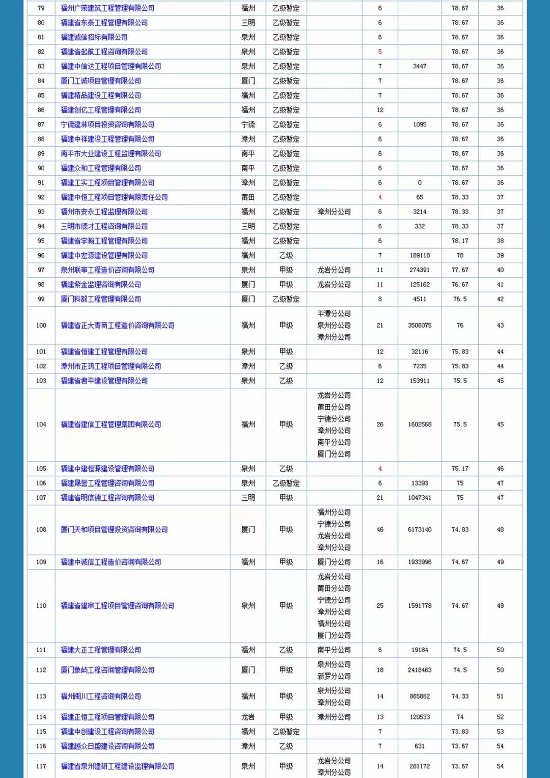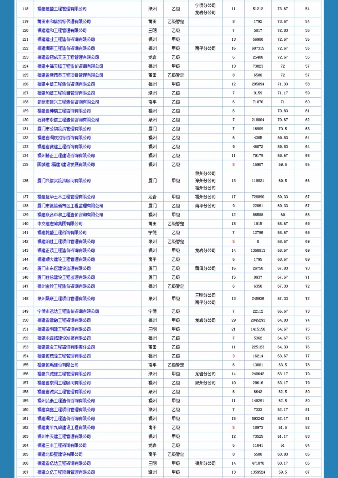 近日,福建省建设工程造价信息网公布《2017年度工程造价咨询企业信用综合评价结果》。 我公司2017年度信用得分排名第七,2017年度备案项目总造价排名第三。两项指标综合体现了我公司综合实力强,在福建业内名列前茅,仅次于央企建行福建省分行。我公司将再接再励,向同行先进单位学习,进一步提高发展!