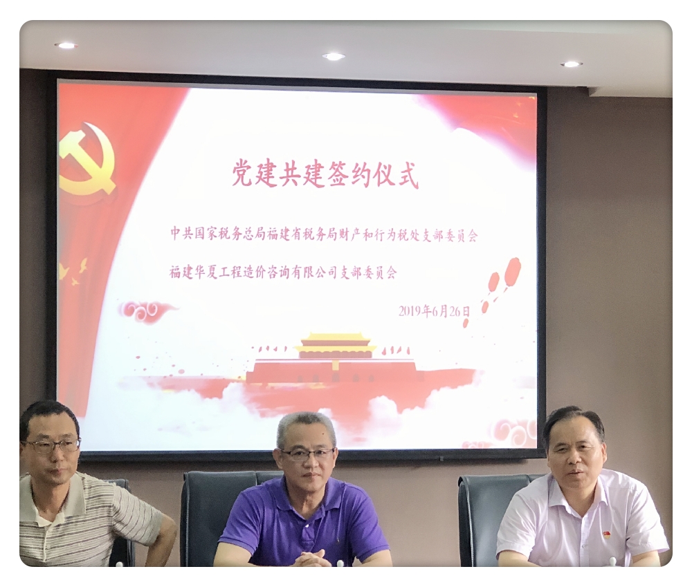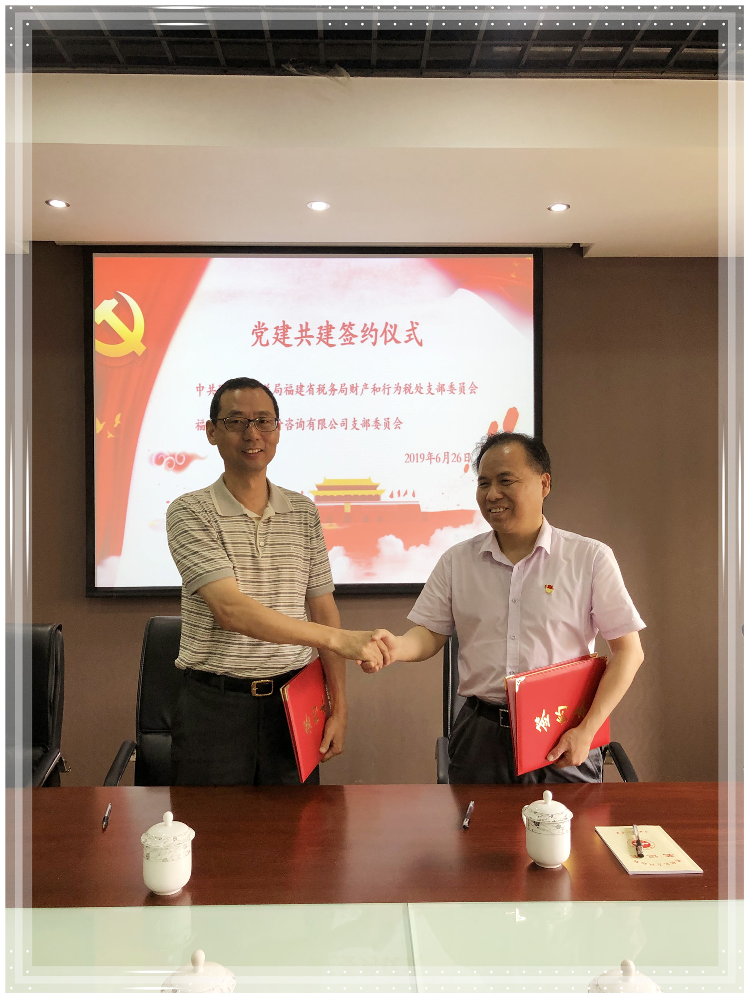 2019年6月26日上午,在即将迎来中国共产党建党98周年的日子里,九州官方网站平台(中国)官方网站党支部与福建省税务局财产和行为税处党支部举行党建共建协议签订仪式。签约仪式在九州官方网站平台(中国)官方网站六楼会议室举行。福建省税务局机关党委副书记张榕、福建省财产和行为税处党支部书记(处长)张锦珊、调研员洪燕忠、副处长林建华、党支部宣传委员苏蕊、九州官方网站平台(中国)官方网站董事长黄启兴、党支部书记李焜明等领导出席了签约仪式,双方党支部20多位党员一同见证了此次签约仪式。